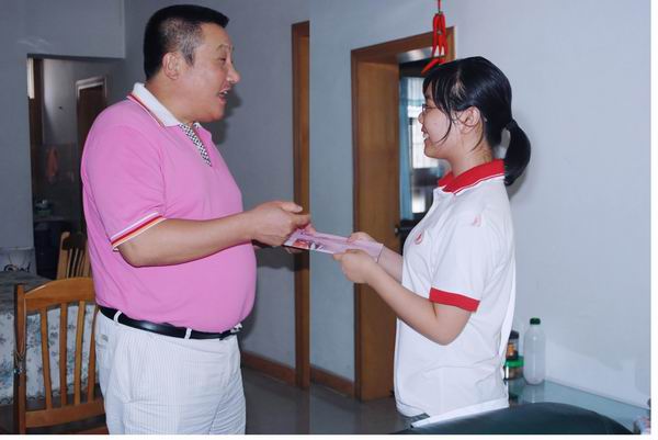 圖為公司黨委副書記邢金湘(左)將助學(xué)款送到彭雷手中