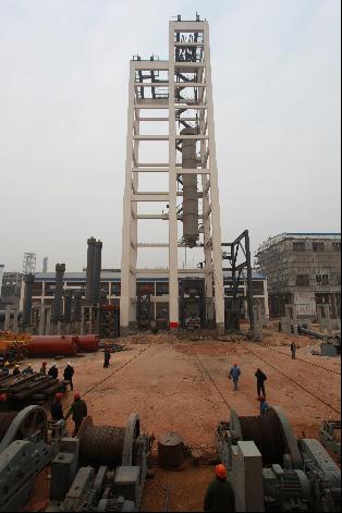 由一處承建的金象18·30合成裝置區(qū)合成氨裝置/醇烷化及氨合成工序需就位靜設備31臺,就位體積最大、重量最重、吊裝難度最大的要算氨合成塔這個龐然大物了,氨合成塔自重390噸,高25米,是山西金象煤化工有限責任公司18萬噸合成氨/30萬噸尿素工程(簡稱18·30工程)兩大主體形象工程之一。