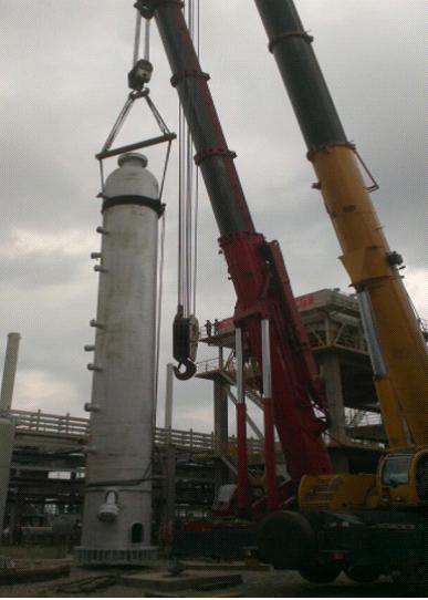 彩云之南寬廣湛藍(lán)的天空下,云南先鋒化工有限公司12萬噸/年寬餾分煤焦油加氫改質(zhì)工程工藝設(shè)備安裝項(xiàng)目的一、二、三級(jí)反應(yīng)器共3臺(tái)設(shè)備高高地矗立在施工現(xiàn)場(chǎng)。安裝制造分公司云南先鋒項(xiàng)目部的施工人員終于長(zhǎng)長(zhǎng)地吁了一口氣,心情激動(dòng)又自豪??偘鼏挝还こ處煹哪樕弦猜冻隽诵θ荨?br />  這樣的笑容來之不易。3臺(tái)反應(yīng)器,最高的有19米多,單臺(tái)重量最大達(dá)到141余噸。總包單位在設(shè)計(jì)的時(shí)候未考慮吊耳。由于材質(zhì)特殊,也無法在設(shè)備上施焊增加吊耳,這是最棘手的。總包單位束手無策,但又不同意項(xiàng)目部提出采用鋼絲繩捆綁式的吊裝方案,猶豫著不愿意簽字,萬一有個(gè)失誤,后果不堪設(shè)想!