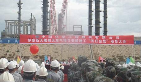 年產(chǎn)20億立方天然氣的伊犁新天項目由山東新汶礦業(yè)集團投資興建,中國化學工程股份有限公司實行EPC總承包。目前工程已進入土建向安裝過渡的關(guān)鍵時期,全面完成今年安裝施工任務(wù)是保證工程實現(xiàn)2014年6月30日機械竣工的前提。適逢新疆施工黃金季節(jié),總承包項目適時吹響了 “百日會戰(zhàn)”的號角。