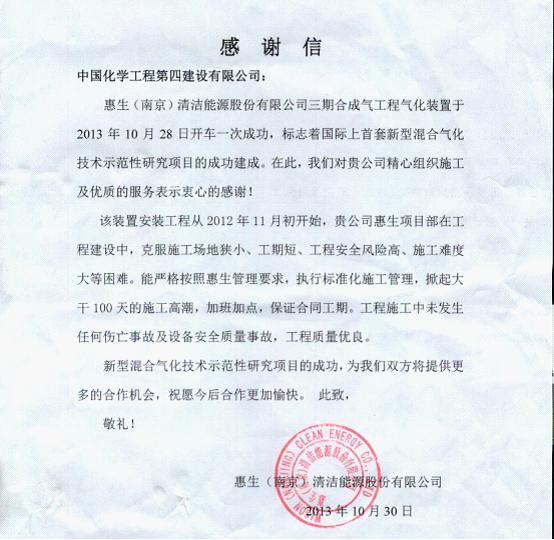 氣化裝置是繼其他各套系統(tǒng)開(kāi)車(chē)成功后最后開(kāi)車(chē)的核心裝置。它的成功開(kāi)車(chē)標(biāo)志著全部施工任務(wù)圓滿(mǎn)完成。分公司在該項(xiàng)目上創(chuàng)造了工程進(jìn)度、質(zhì)量安全、業(yè)主服務(wù)三個(gè)一流,用心血和汗水為業(yè)主奉獻(xiàn)了精品工程,展示了化建湘軍的風(fēng)采,更獲得了業(yè)主來(lái)信高度贊揚(yáng)!
